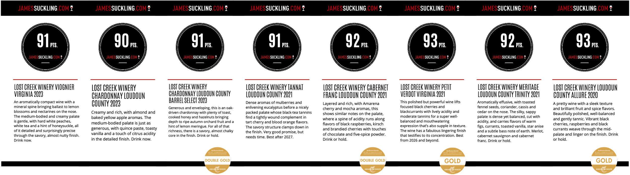 Lost Creek Winery is redefining Virginia wine with precision, purity, and distinction. Nestled at the base of the Blue Ridge Mountains in Loudoun County, our estate produces terroir-driven wines that have earned consistent critical acclaim. James Suckling has awarded multiple 90+ scores across our portfolio - including 93 points for Petit Verdot, 92 points for Cabernet Franc and Trinity, and 91 points for Tannat and Chardonnay - affirming the quality and consistency that buyers can trust